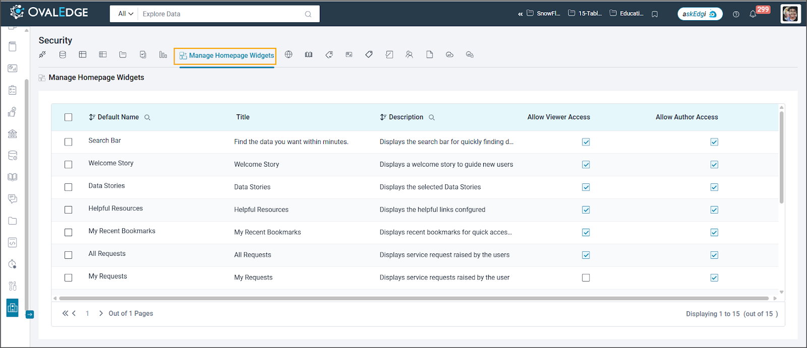 The “Manage Homepage Widgets Security” allows administrators to control viewer and author access to homepage widgets, determining what each user type can view or modify.