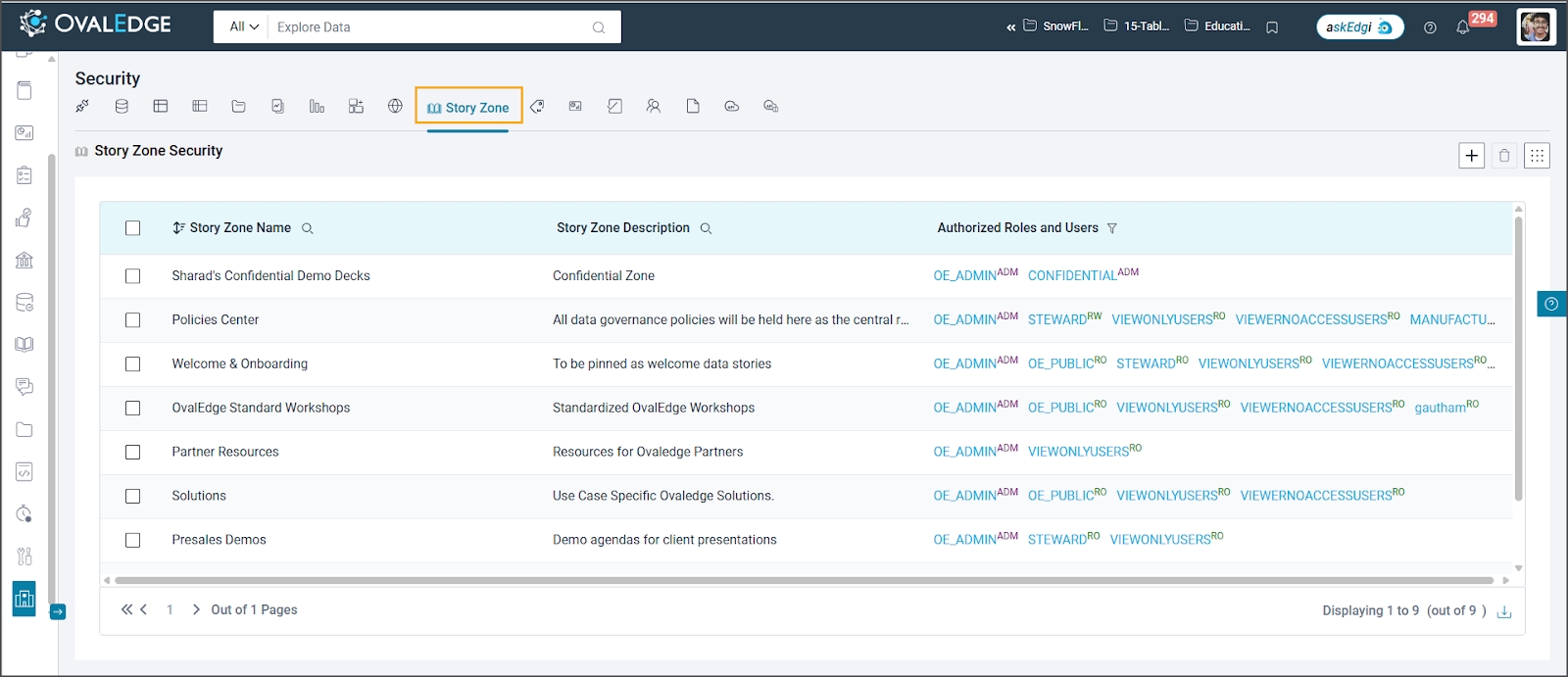 Users with SGA and OE_ADMIN roles can manage access permissions for Story Zones within OvalEdge.
