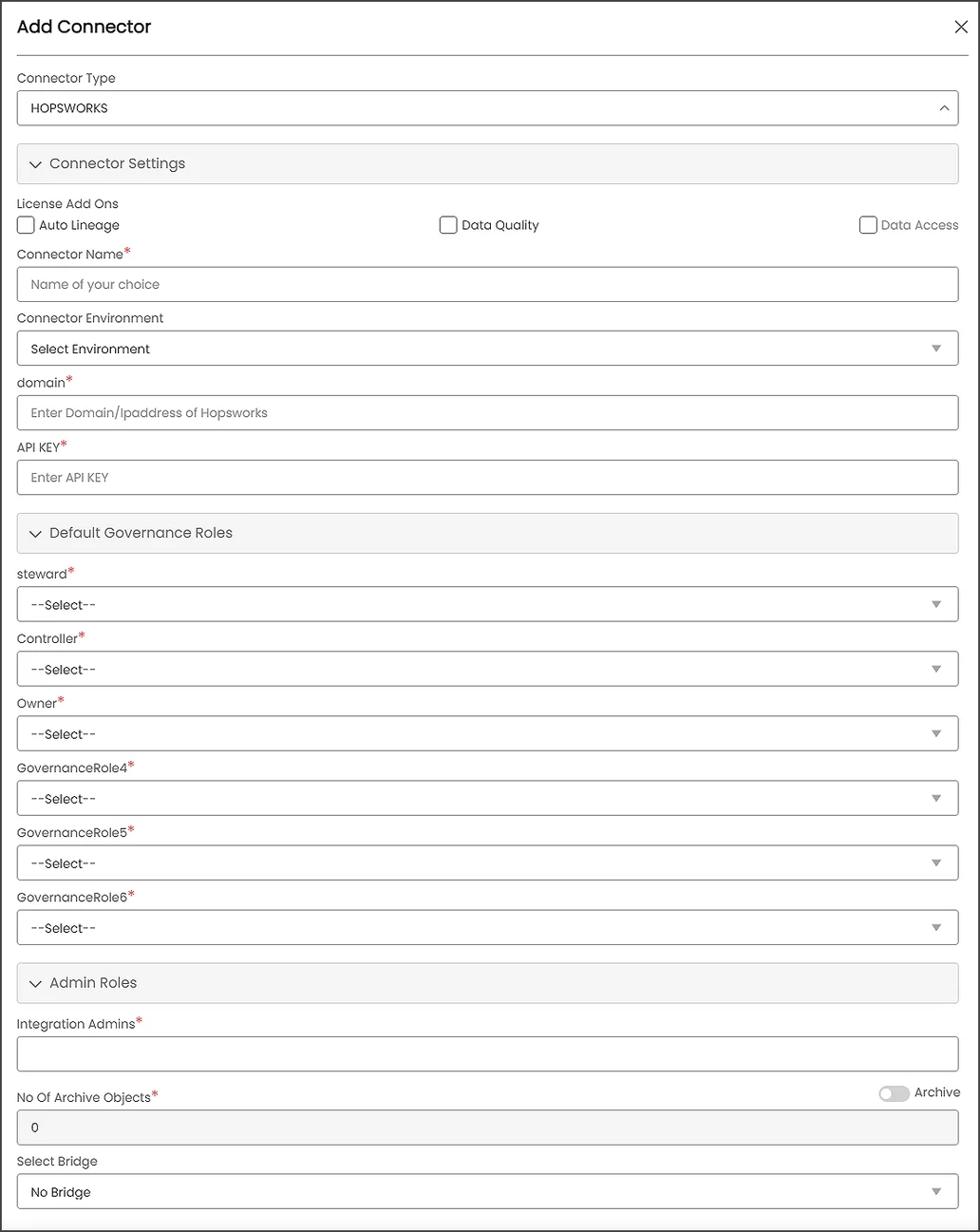 Select the connection type as Hospworks. The Add Connector with Hospworks-specific details is displayed.