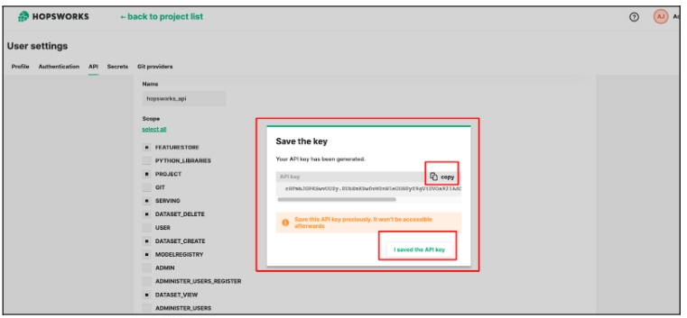 OvalEdge uses REST API to connect to Hopsworks. API Key is needed to connect to Hopsworks. For more information, refer to the section How to Generate the API Key?