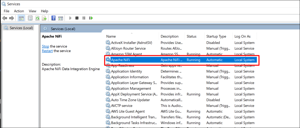 Check if the Apache NiFi-1.28.1 service is listed and running.