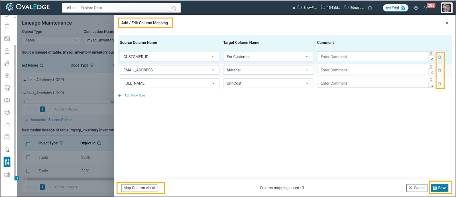 Users can select the Source Column Name and Target Column Name from the dropdown list and specify comments as needed.