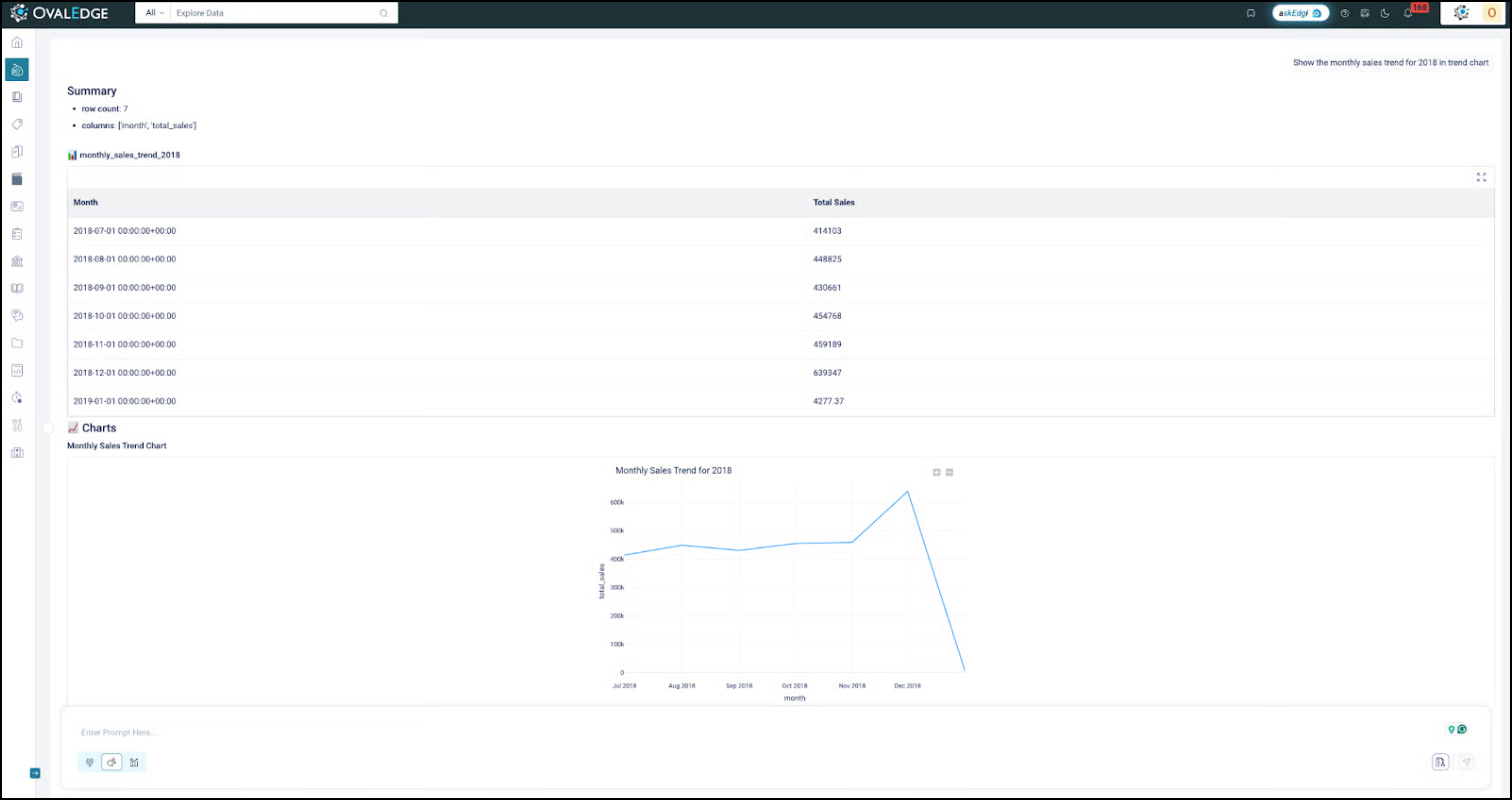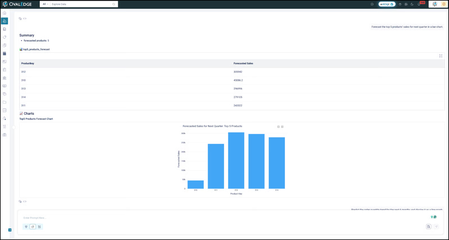 askEdgi eliminates these barriers by enabling natural language analysis directly in the Workspace. Files can be uploaded or catalog objects added, and queries can be expressed in plain language. The assistant responds with text summaries, tables, or visualizations, reducing reliance on SQL scripts or BI tools.