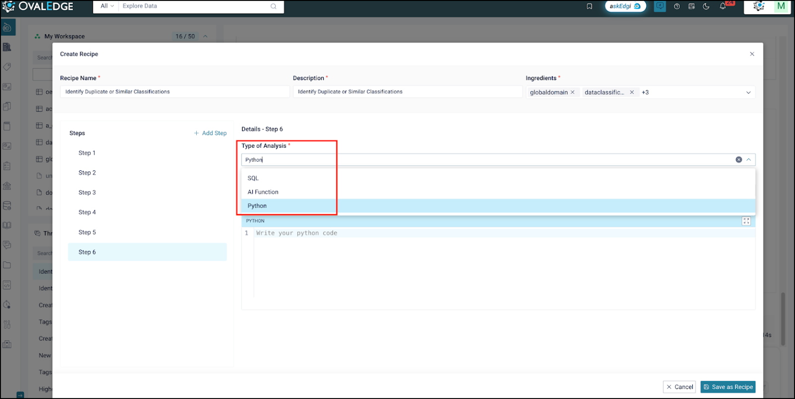 Execution restricted to metadata recipes using the OvalEdge (-1 connector).