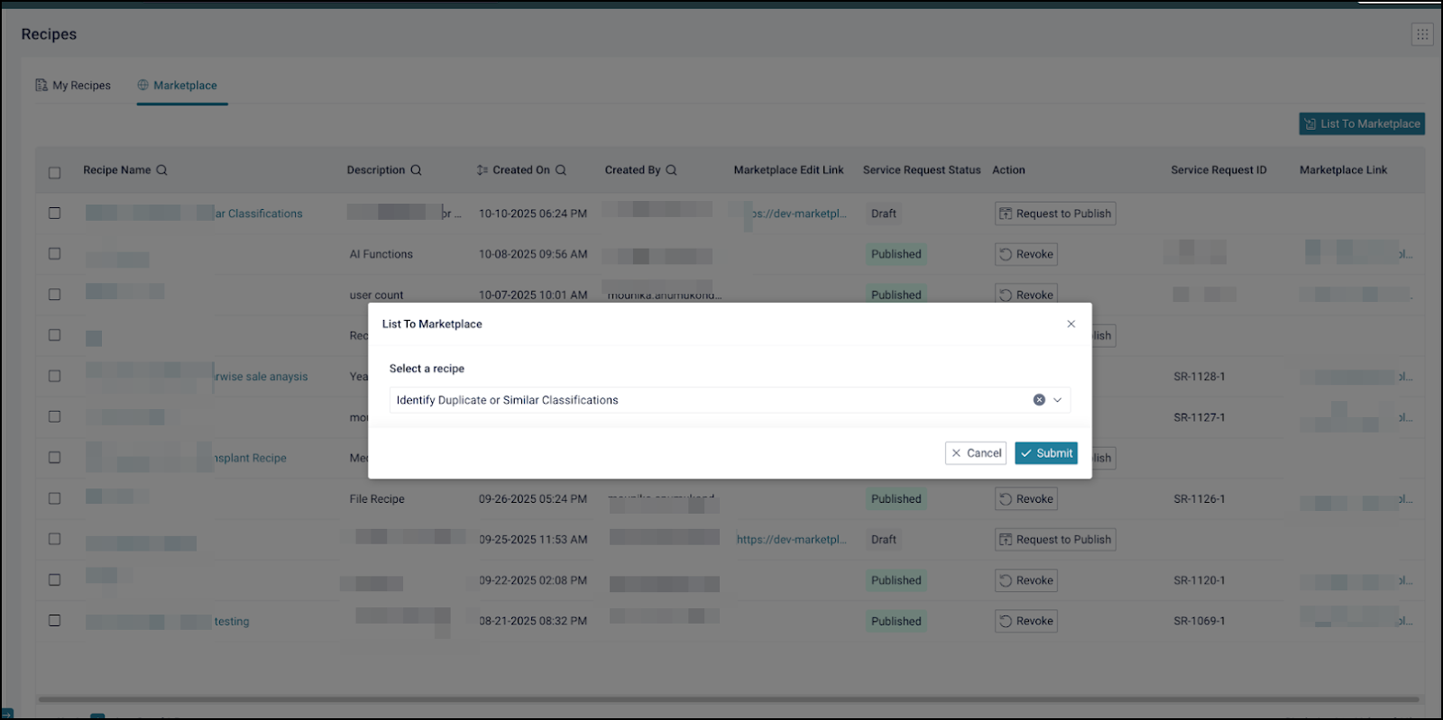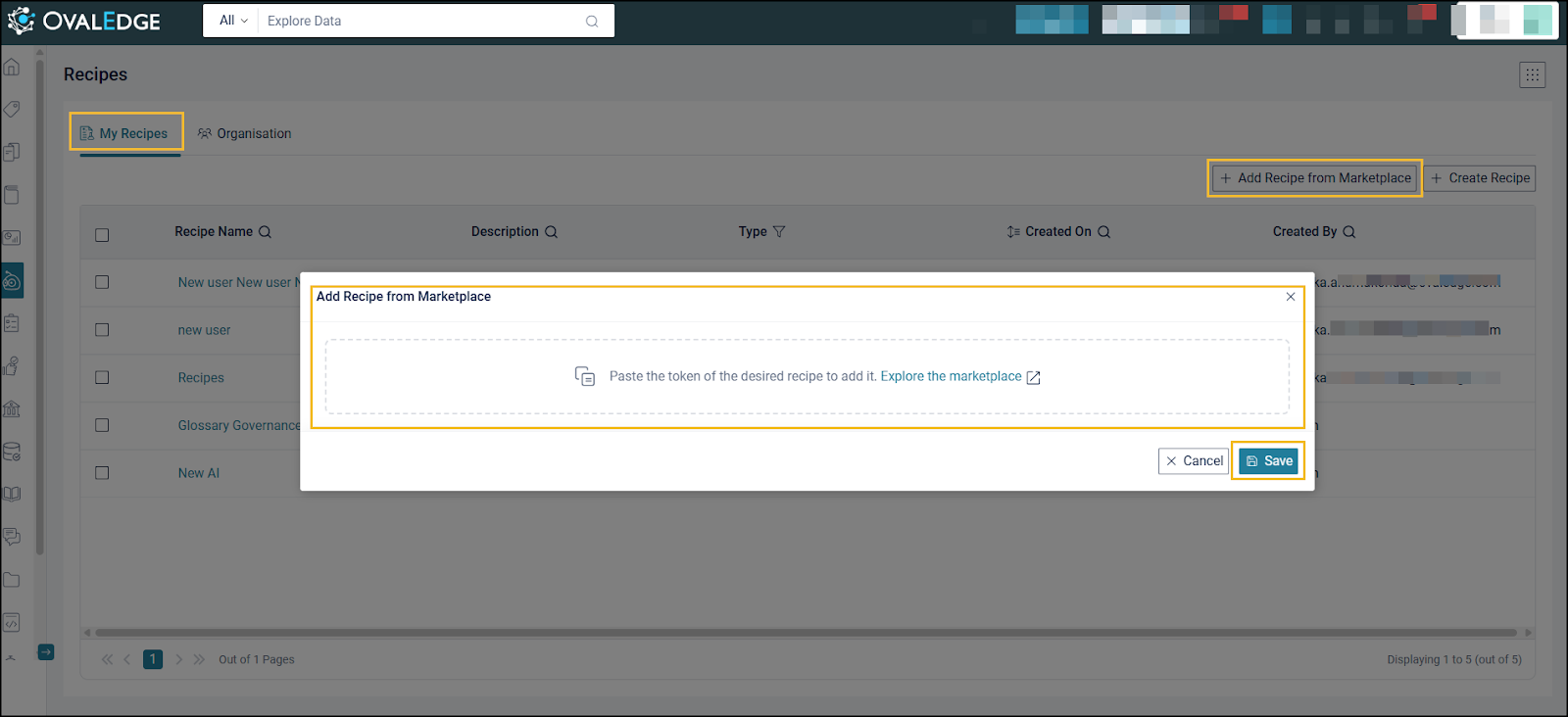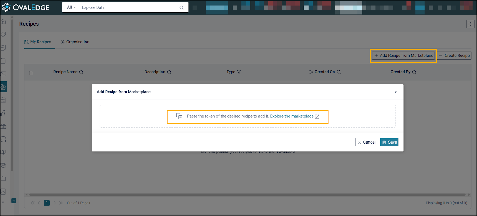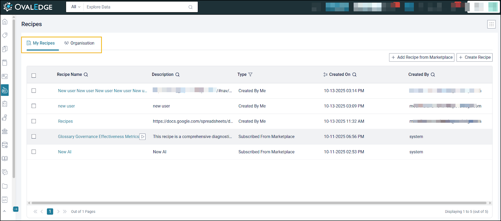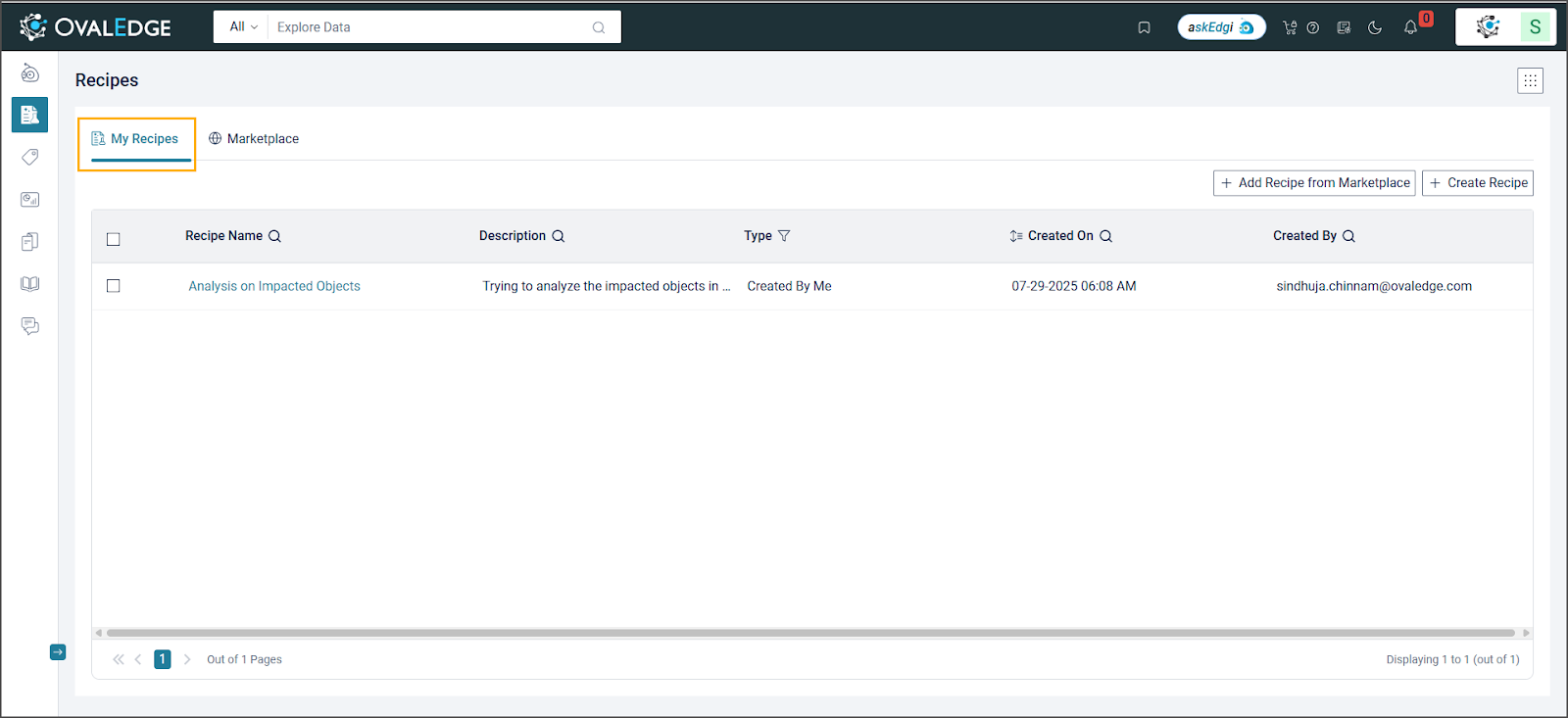 Recipes created in this environment can be shared internally. Access to the Public Marketplace remains optional and dependent on organizational policy. Marketplace recipes that rely on the OvalEdge -1 connector can also be utilized if permitted by governance settings.