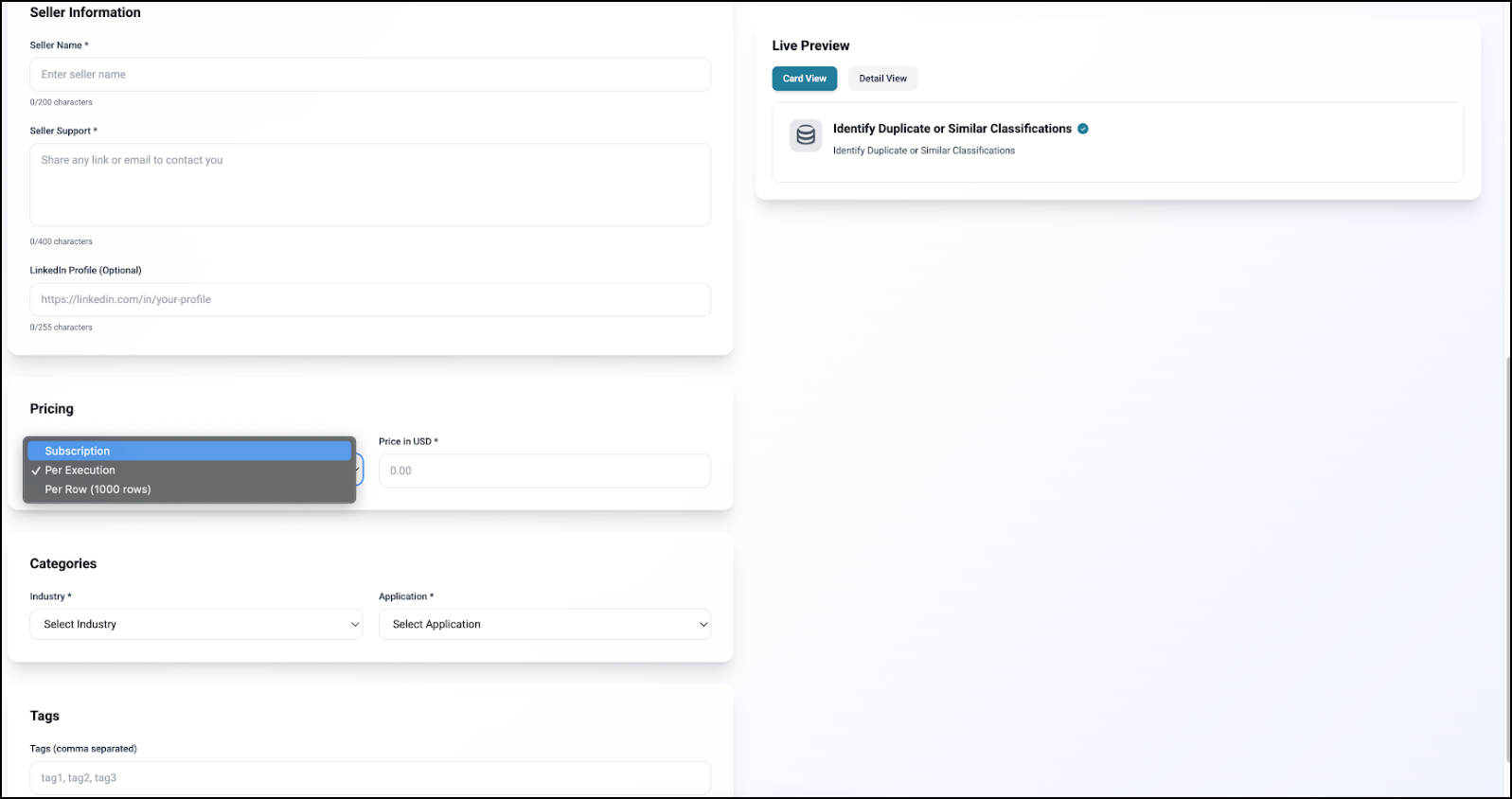 Seller Information: Contact details, optional LinkedIn profile