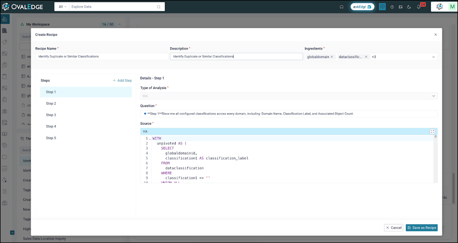 Recipes can be created internally for analyzing metadata assets and executed only when configured with the OvalEdge (-1 connector). These recipes remain within the enterprise environment, ensuring no external data movement or Marketplace dependency.