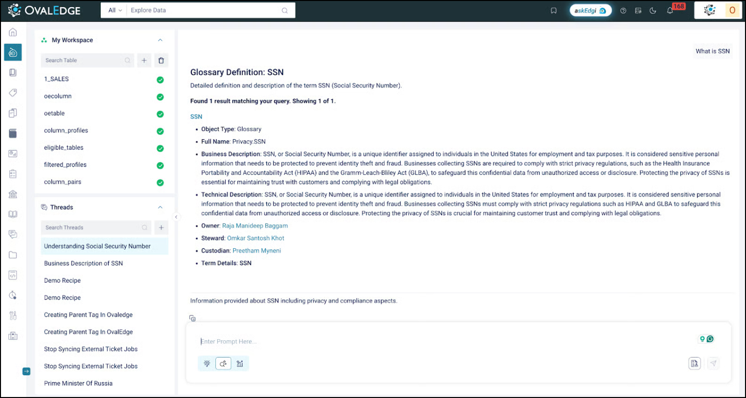 The askEdgi delivers data quality and curation scores, along with ownership and stewardship information. Within two queries, the analyst identifies the correct table, understands its context, and verifies compliance classifications - without writing SQL or browsing schemas.