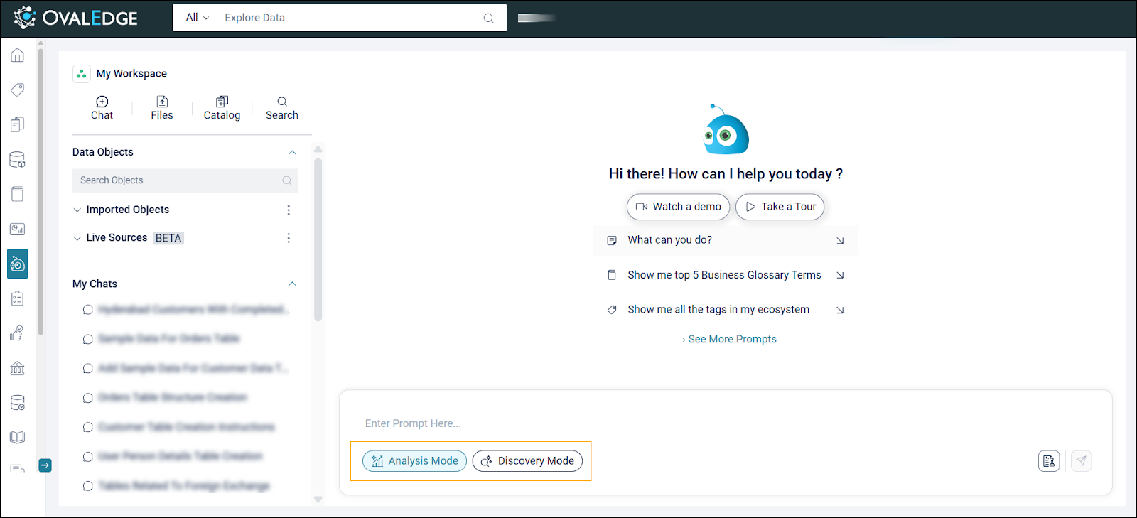 <table><thead><tr><th width="219.8333740234375">Mode</th><th>Functionality</th></tr></thead><tbody><tr><td>Discoveryᵝ</td><td>Searches and retrieves catalog information such as datasets, tables, glossary terms, and governance details. The mode focuses on structured exploration and metadata understanding without performing analytical execution.</td></tr><tr><td>Analysis</td><td>Performs end to end intelligence and execution. The mode interprets intent, retrieves relevant enterprise context, validates dataset relationships, and performs analysis on eligible workspace data. It supports business aligned explanations and analytical outputs such as summaries, tables, or visual insights.</td></tr></tbody></table>