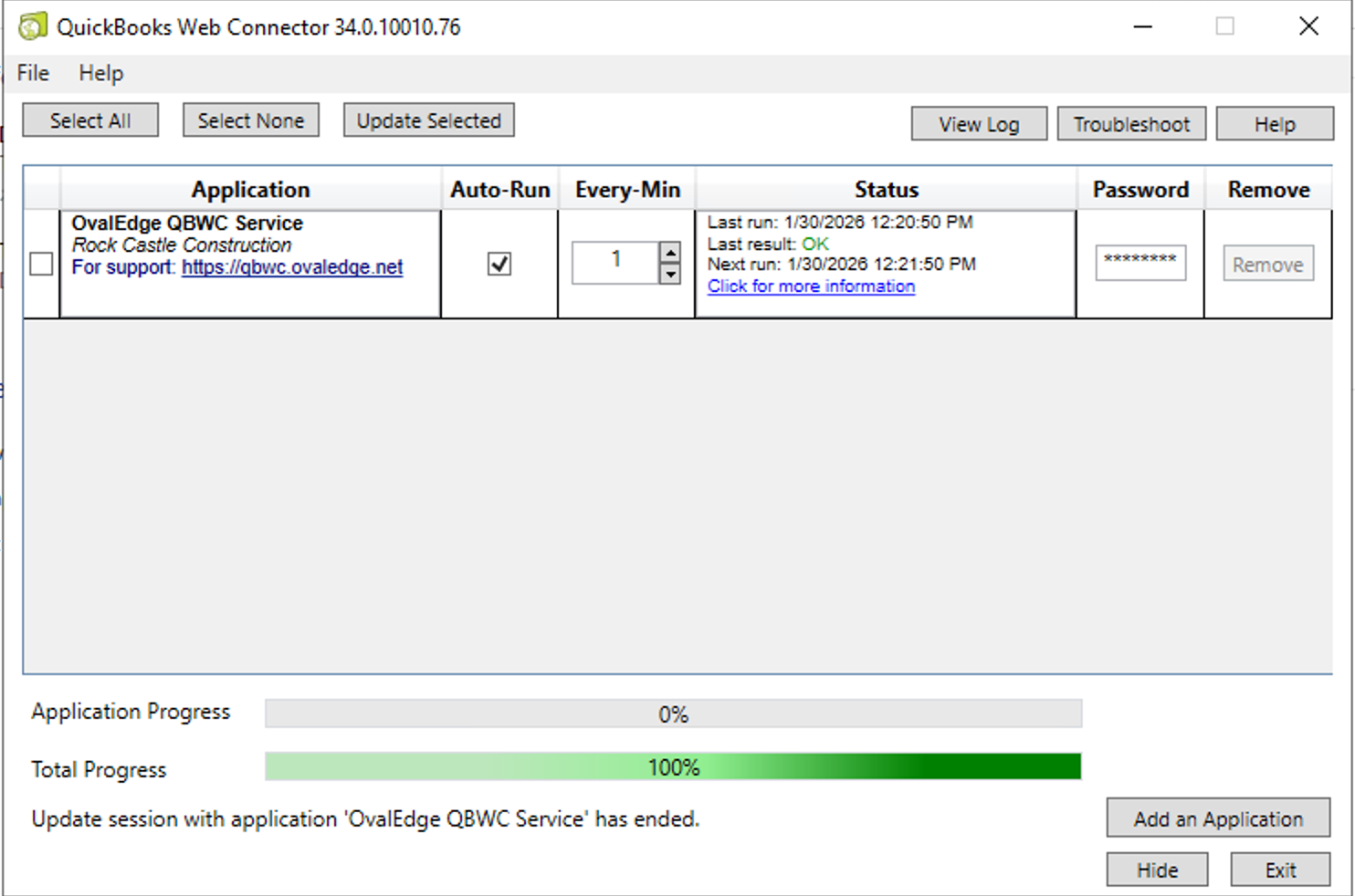 Once added, the application will appear in the QuickBooks Web Connector application list.