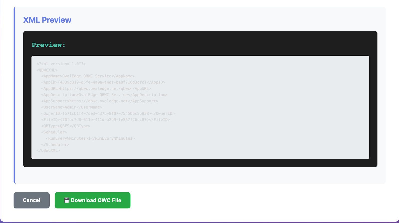 The .qwc file can be previewed or downloaded directly from the QBWC service.