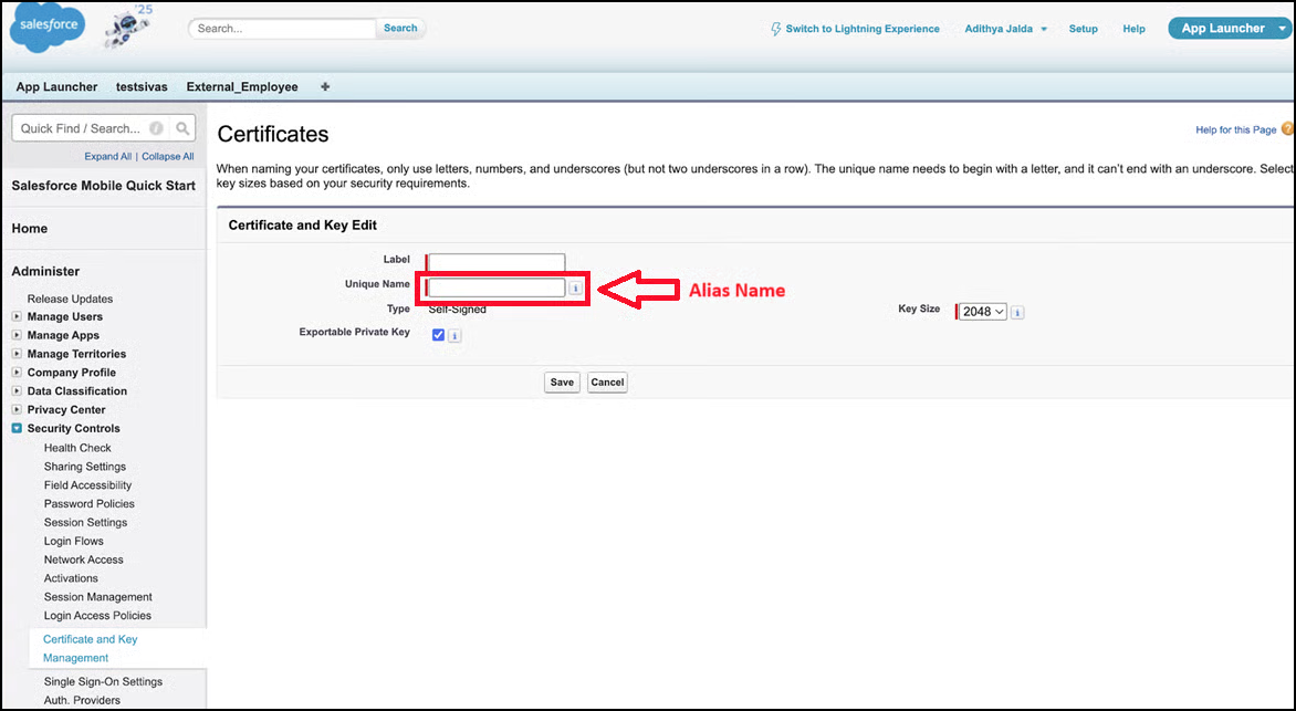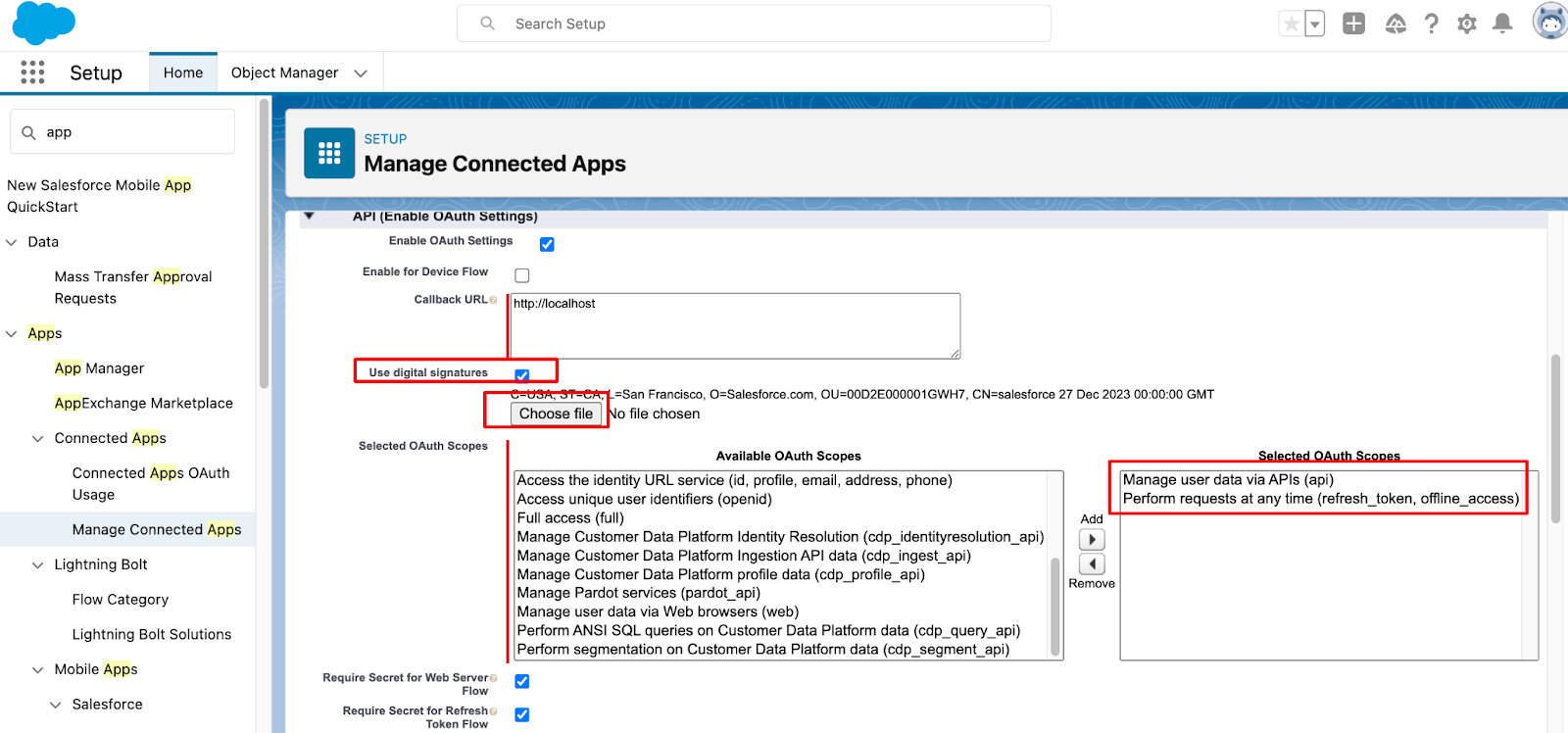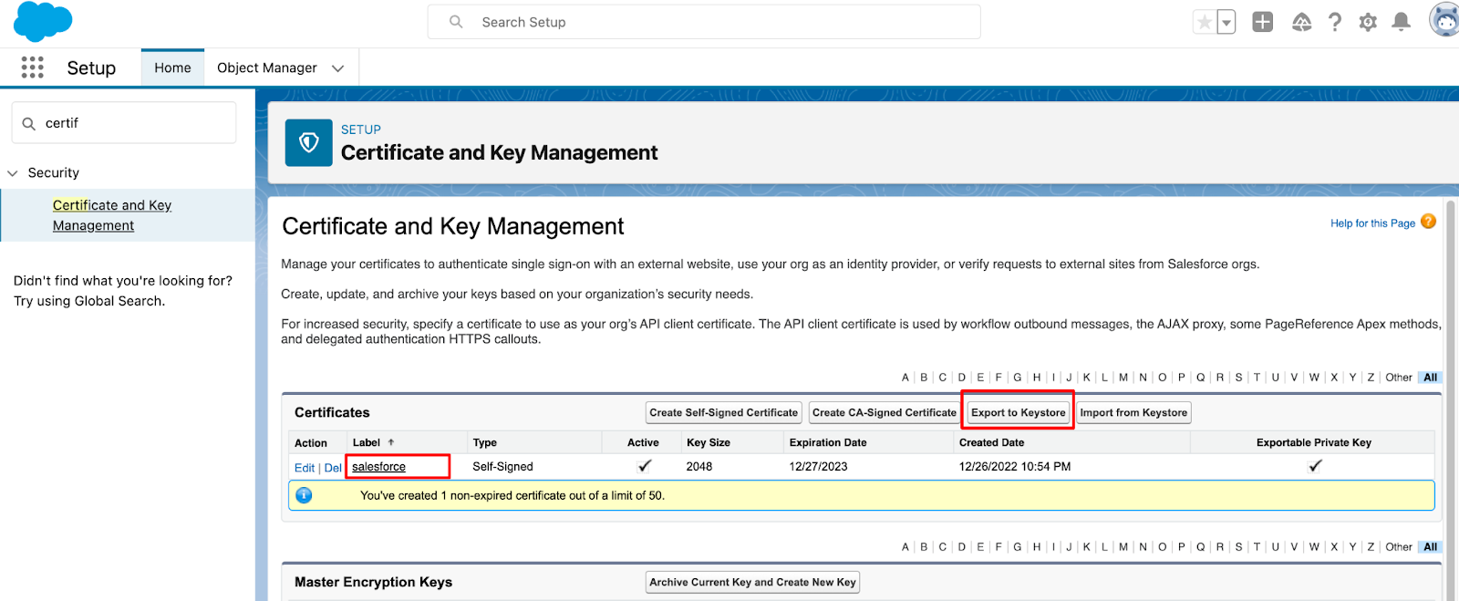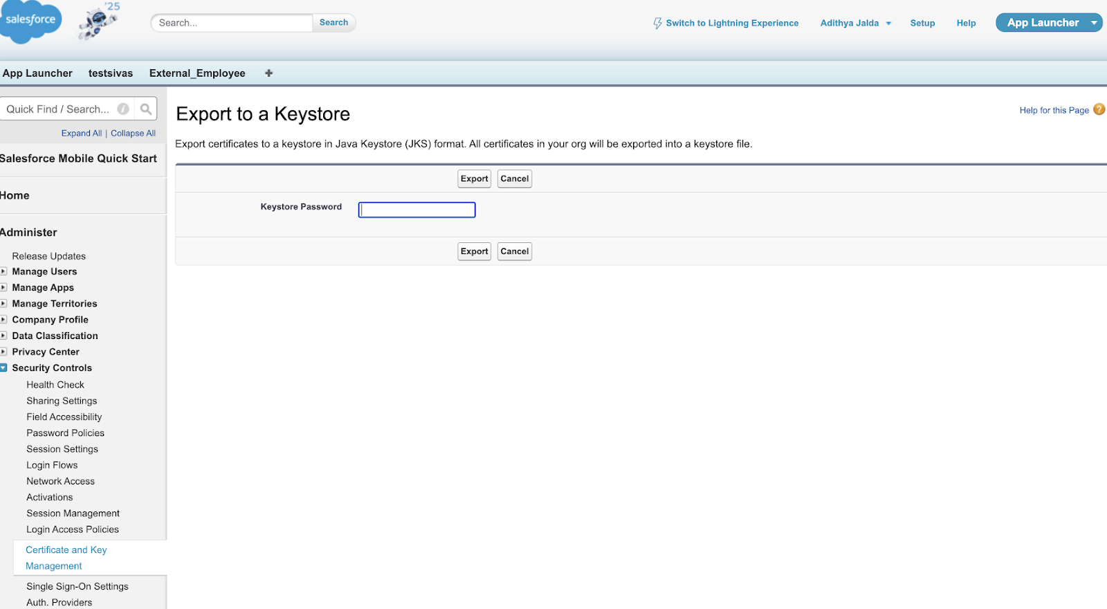 After configuring the app, export the JKS file using the certificate created in Salesforce.