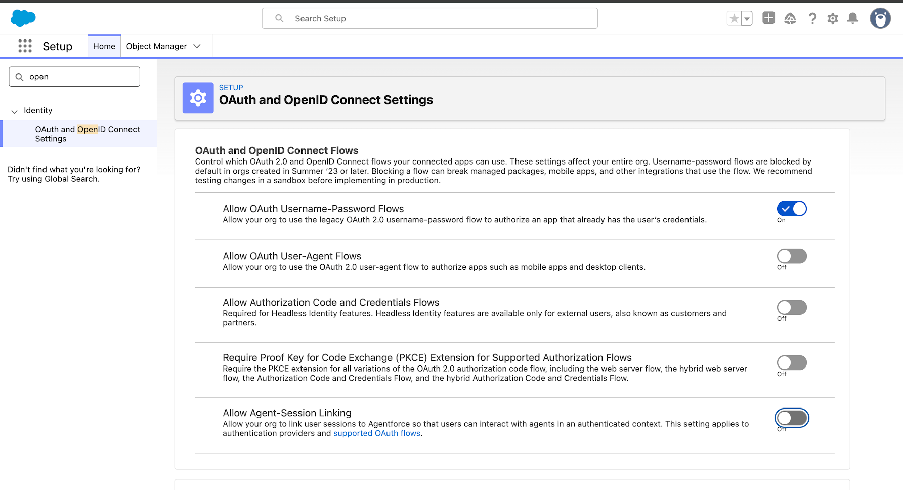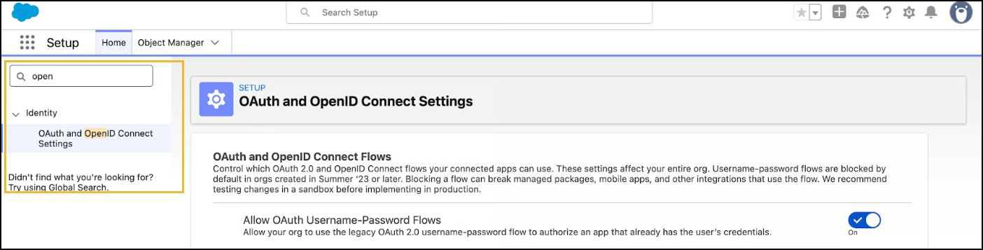 In the Salesforce Setup Quick Search box, enter OpenID or OAuth.
