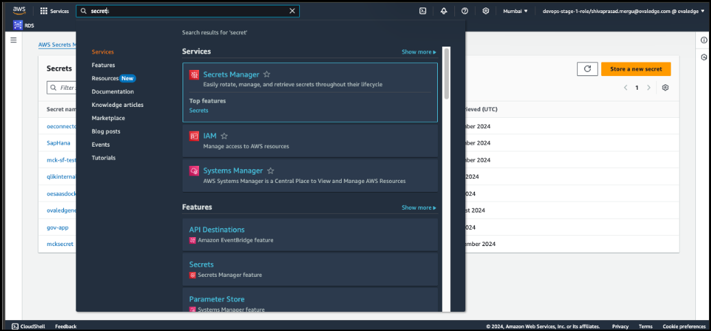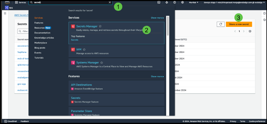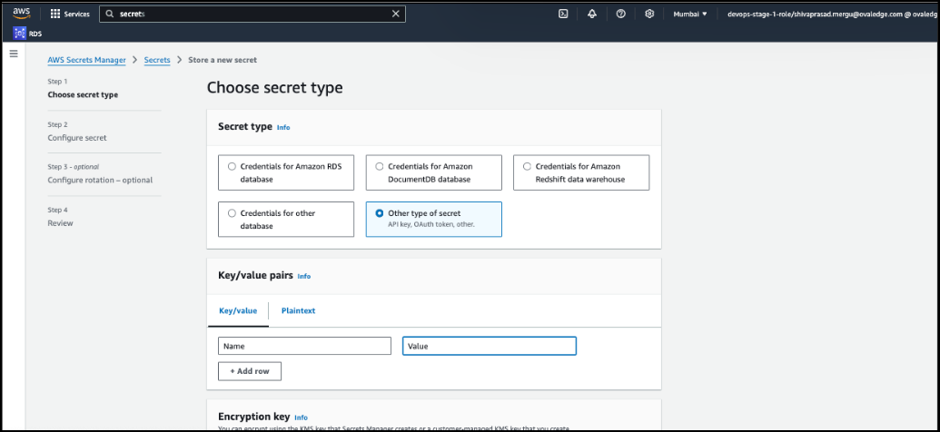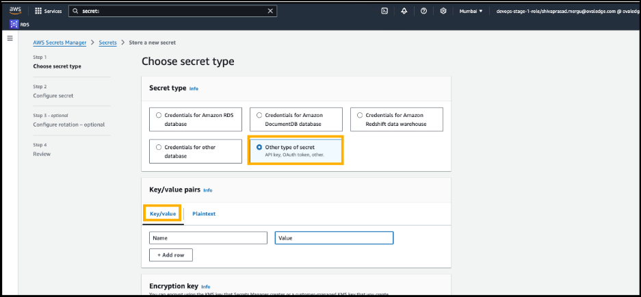 In the search bar, search for Secrets Manager, then select Store a new secret.
