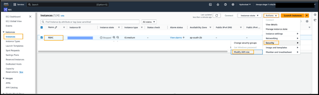 Go to the OvalEdge application running the EC2 Instance and then navigate to the below-mentioned configuration steps. Go to Actions > Security > Modify IAM Role for the EC2 instance.