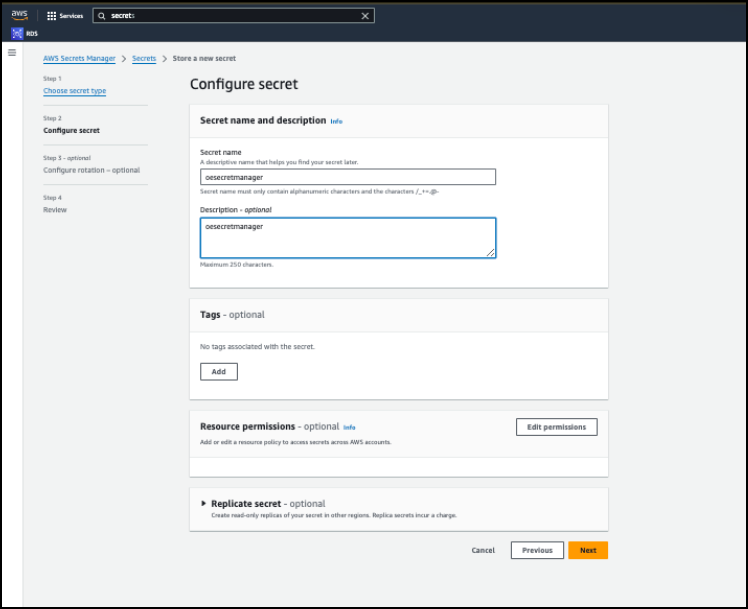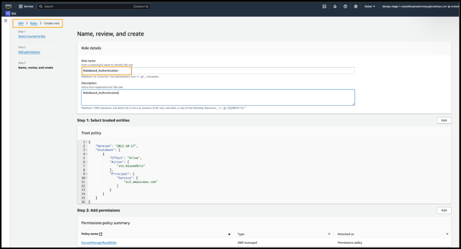 Log in to the AWS Console and create an IAM Role as per the screen below.Amazon Web Services (AWS) Secret Manager helps you to securely store and manage passwords, database strings, and API keys. Secrets can be stored, managed, and retrieved conveniently and securely through a central repository.