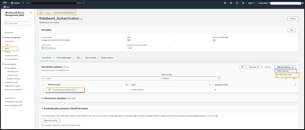 Create an Inline policy in IAM Permissions as per the provided below.