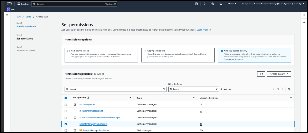 In the Set permissions page, select the ‘Attach policies directly’ button and select the SecretsManagerReadAccess.