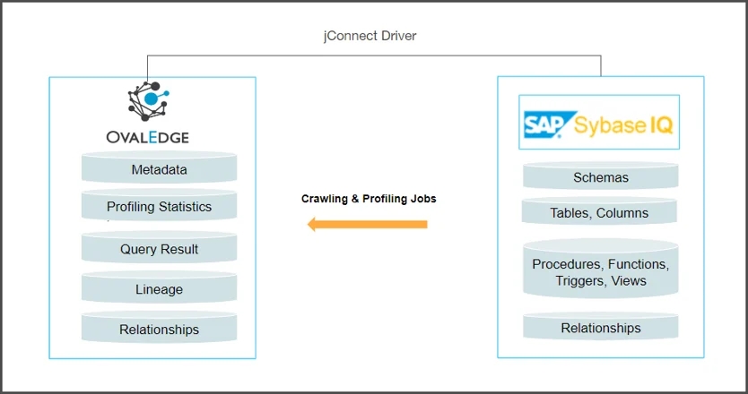 OvalEdge enables connectivity to Sybase IQ using the jConnect (jconn4) driver, allowing for tasks such as crawling database objects, profiling sample data, executing queries, building relationships, and lineage.