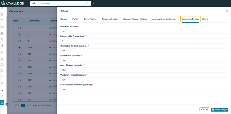 The Connectors module provides configurable connection pooling settings within the application. This feature enables precise management of database connection parameters for improved flexibility, performance, and consistency across all RDBMS connectors.
