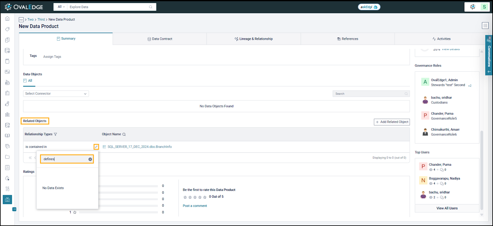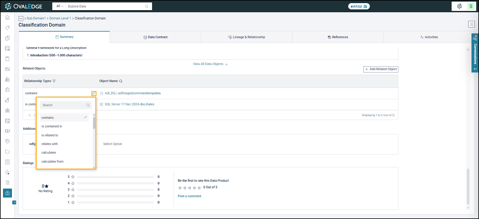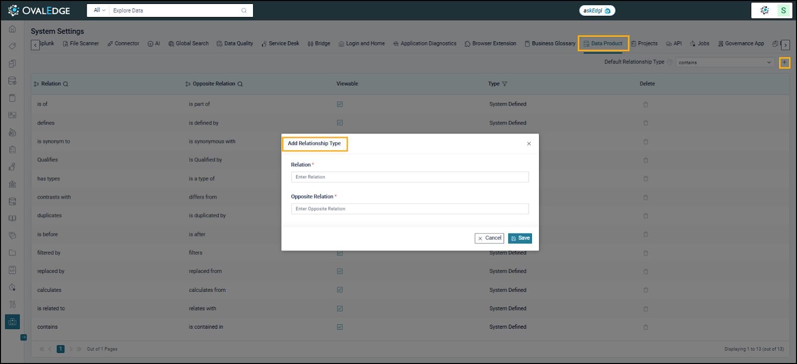 OvalEdge provides predefined relationship types for defining Data Product relationships. If the predefined types are insufficient, an Admin can configure custom relationship types for Meta-Write users to use when curating a Data Product.