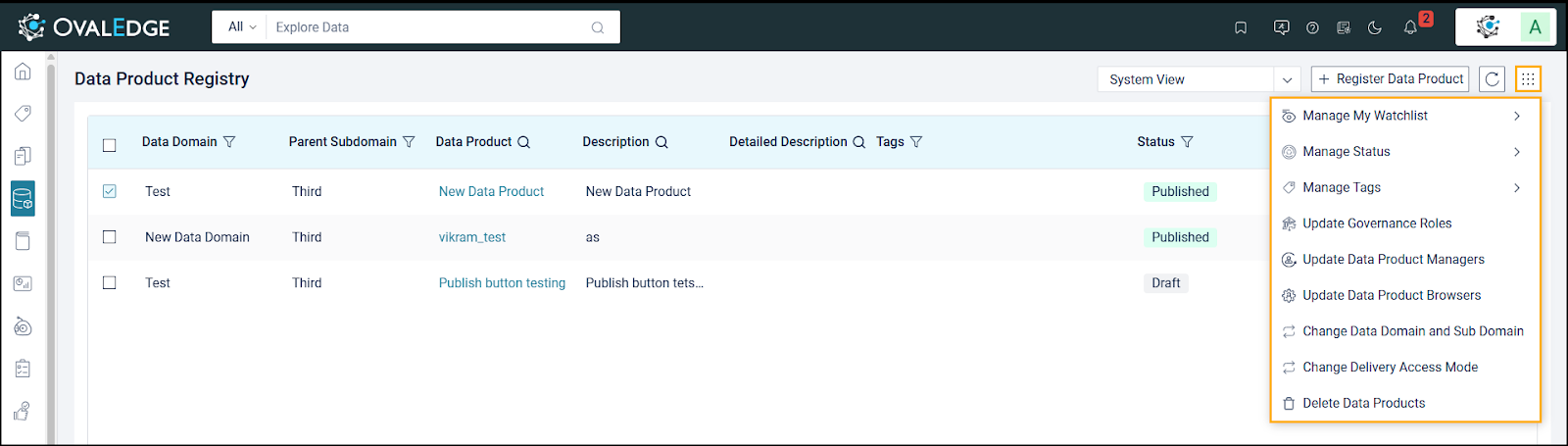Manage Status: Update lifecycle status (Draft or Published) for selected Data Products in bulk.