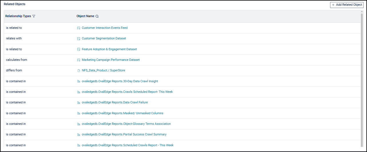 Related Objects help identify and manage synonymous and related Data Products, maintaining consistent business definitions and accurate relationships. By defining and maintaining these relationships, the Data Product Manager keeps related Data Products governed consistently.