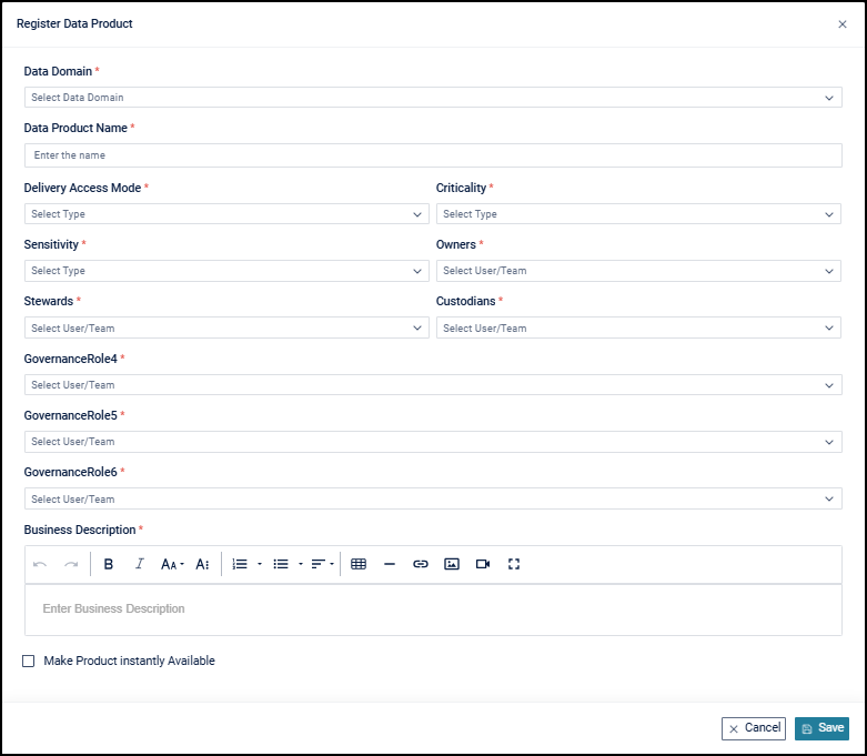 During registration, the Data Product Manager provides key metadata, including Data Domain, Data Product Name, Delivery Access Mode, Criticality, and Sensitivity. The Data Product Manager assigns governance roles such as Owner, Steward, Custodian, and other configured roles to establish accountability throughout the Data Product lifecycle.