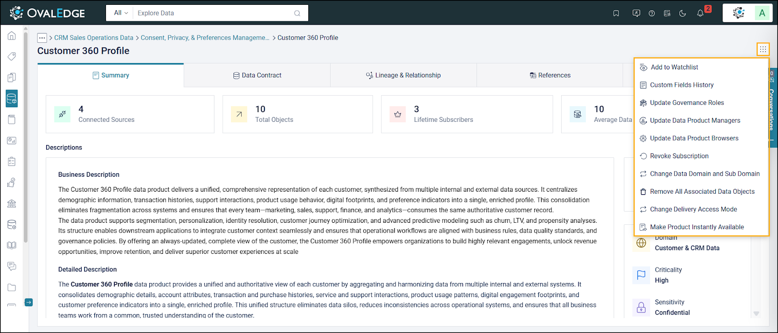 The Data Product Manager defines related data objects and relationships. The Criticality and Sensitivity are updated to reflect business importance and data classification.