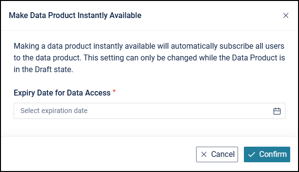 Make Product Instantly Available: Publish the Data Product for immediate access without approval. An expiry date must be set.