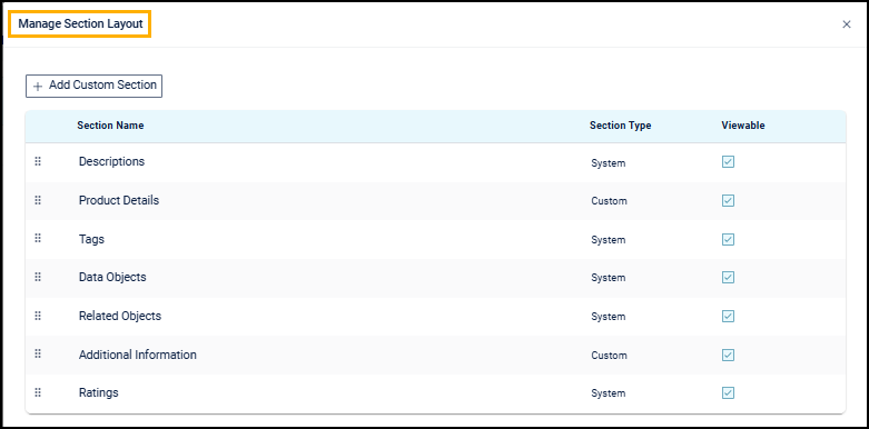 Manage Section Layout lets Users add, edit, or delete custom sections, reorder section names, and hide sections as needed.