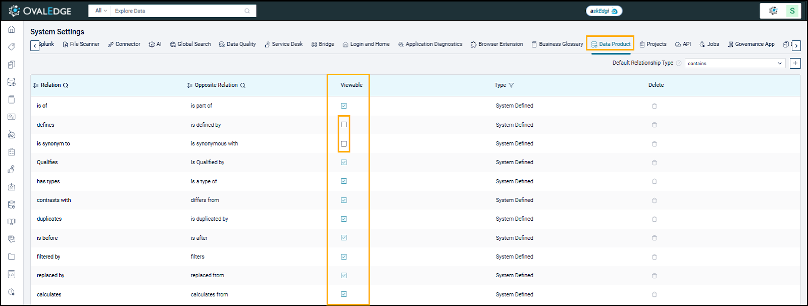 Users control the visibility of system and custom relationship types in System Settings. In Administration > System Settings > Data Product, use the Viewable column to show or hide each relationship type. Hidden relationship types do not appear in the relationship edit search in the Data Product Summary. For example, ‘defines’ and ‘is synonym to’ are hidden when they are not selected.