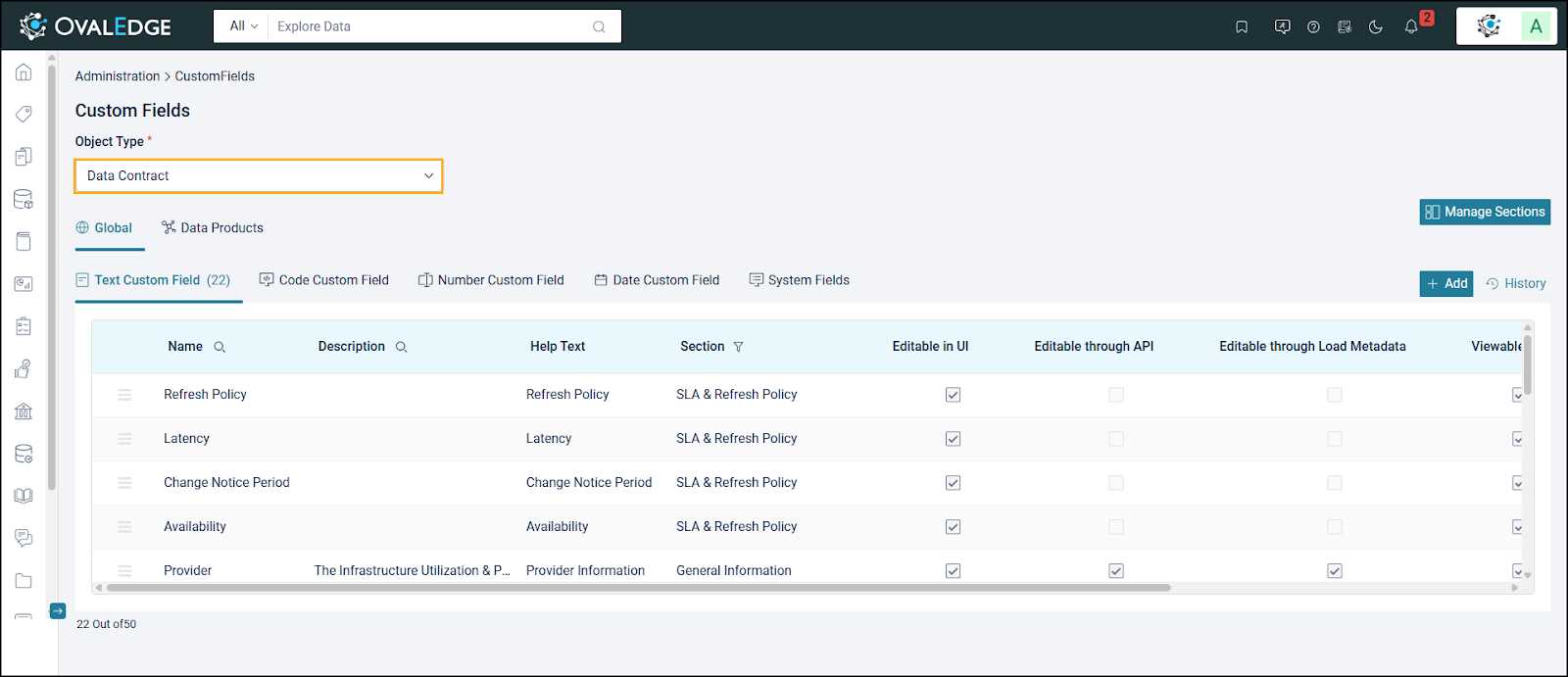 Selecting Manage Data Contract opens Custom Fields, where the Data Product Manager manages contract-specific fields either globally or for a specific Data Product.