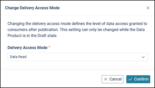 Change Delivery Access Mode: Change the delivery access mode (Data Preview or Data Read) for selected Data Products.