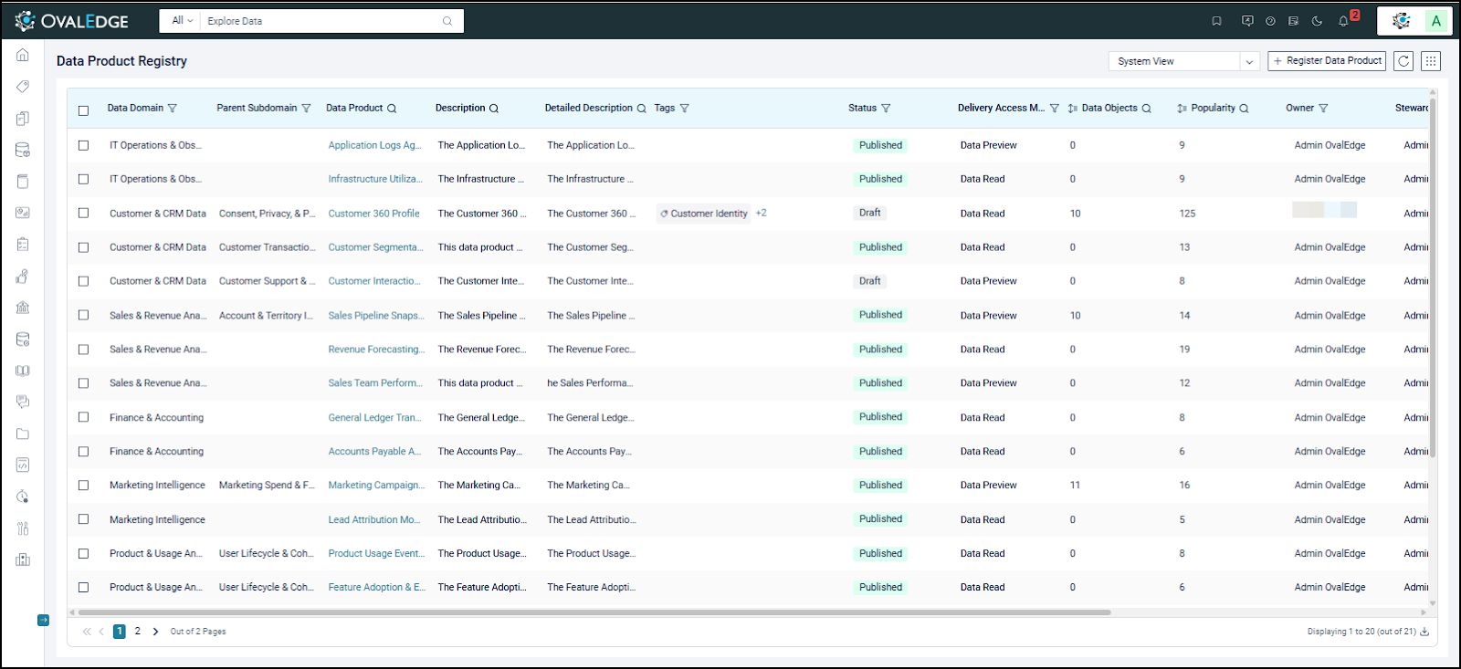 The Data Product Registry is the central workspace for registering, curating, and managing Data Products before publication to the Marketplace. Data Product Managers use it to define metadata, assign governance roles, associate supporting data objects, configure delivery access modes, and start publishing workflows.