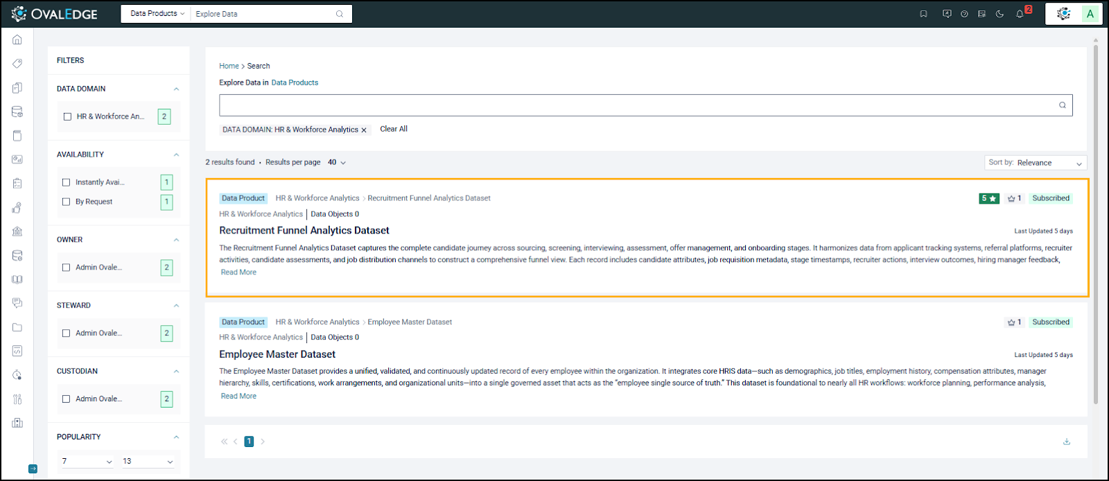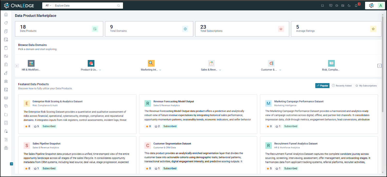 Featured Data Products are selected based on system-defined usage criteria. The system highlights them based on popularity, recent additions, and the User’s subscriptions, helping Data Browsers discover relevant published Data Products.