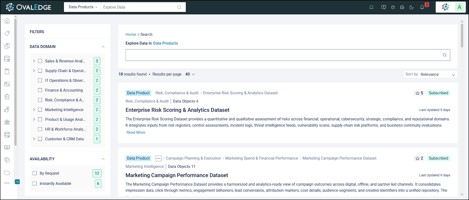The Data Product Marketplace is a central location where the User can discover, request, and consume governed Data Products. It supports self-service access with approvals, quality indicators, ownership details, and usage insights while maintaining governance and compliance. The Marketplace shows all published Data Products that the User can access based on role and domain permissions.