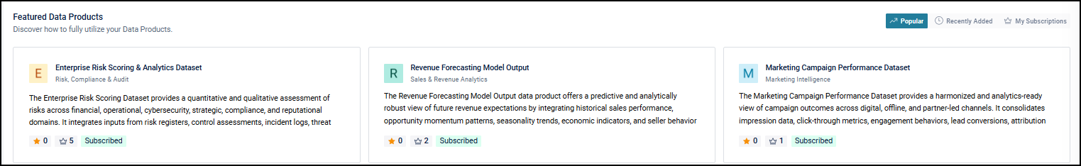 This section shows recommended Data Products based on usage and relevance. It shows up to 12 Data Product cards and provides three filters for easier exploration: