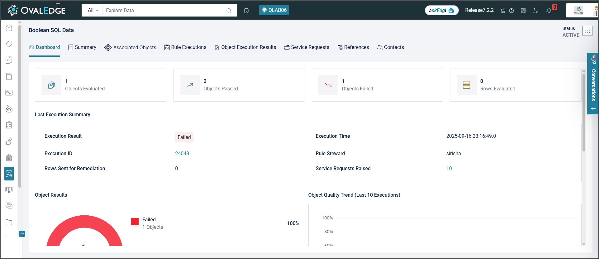 Objects Failed: Number of objects that failed the rule in the last execution. Clicking on this card opens the Object Execution Results page filtered to show only failed objects.