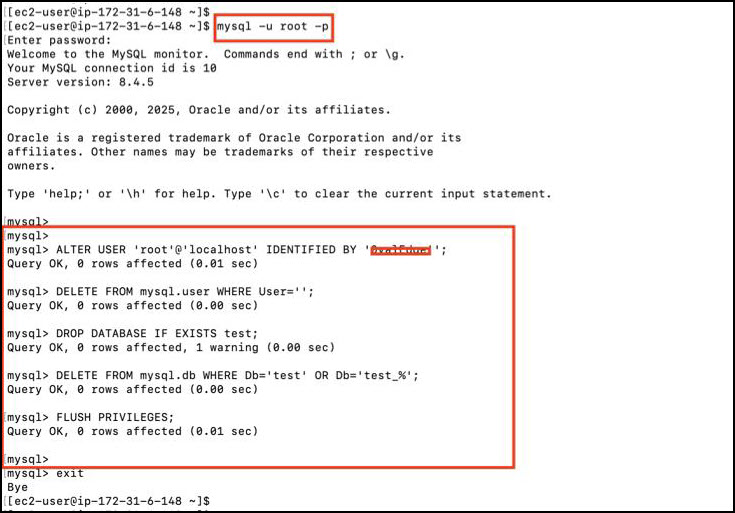 ALTER USER 'root'@'localhost' IDENTIFIED BY '<new_secure_password>'; DELETE FROM mysql.user WHERE User=''; DROP DATABASE IF EXISTS test; DELETE FROM mysql.db WHERE Db='test' OR Db='test_%'; FLUSH PRIVILEGES;