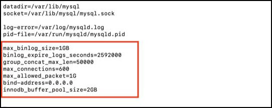 sudo vi /etc/my.cnfmax_binlog_size = 1G binlog_expire_logs_seconds = 2592000 group_concat_max_len = 4294967295 max_connections = 600 max_allowed_packet = 1G bind-address = 0.0.0.0 innodb_buffer_pool_size = 8G