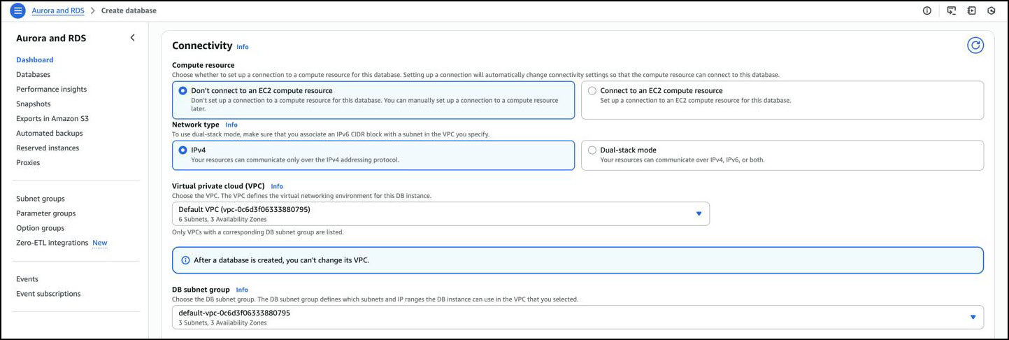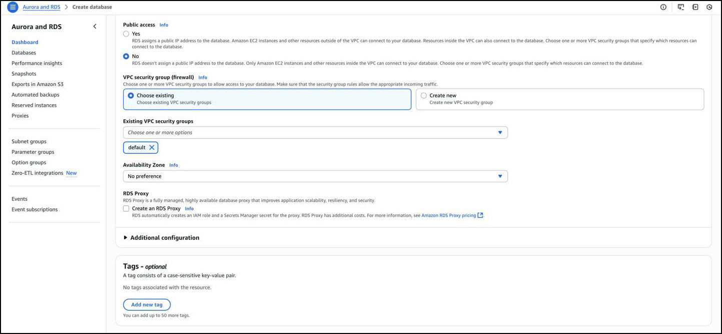 Select the appropriate VPC, Subnet group, and Security group as per the Cloud/Networking team’s recommendations.