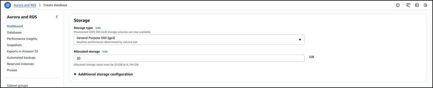 Allocated storage size (e.g., 100 GB, scalable as required).