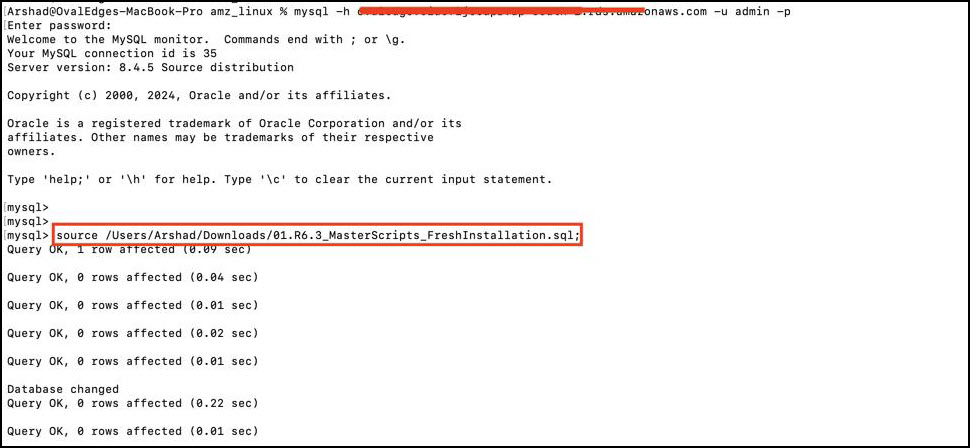 From the MySQL prompt, execute the OvalEdge Masterscripts.sql file: