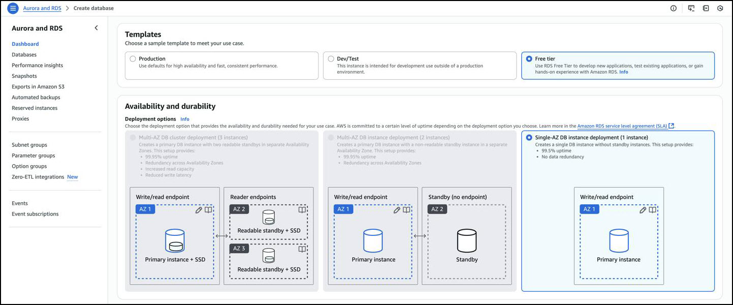 Configure Templates, Availability, and Durability based on organizational requirements (e.g., Multi-AZ for high availability).