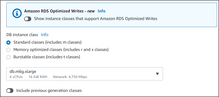 Choose the desired DB instance class (e.g.,