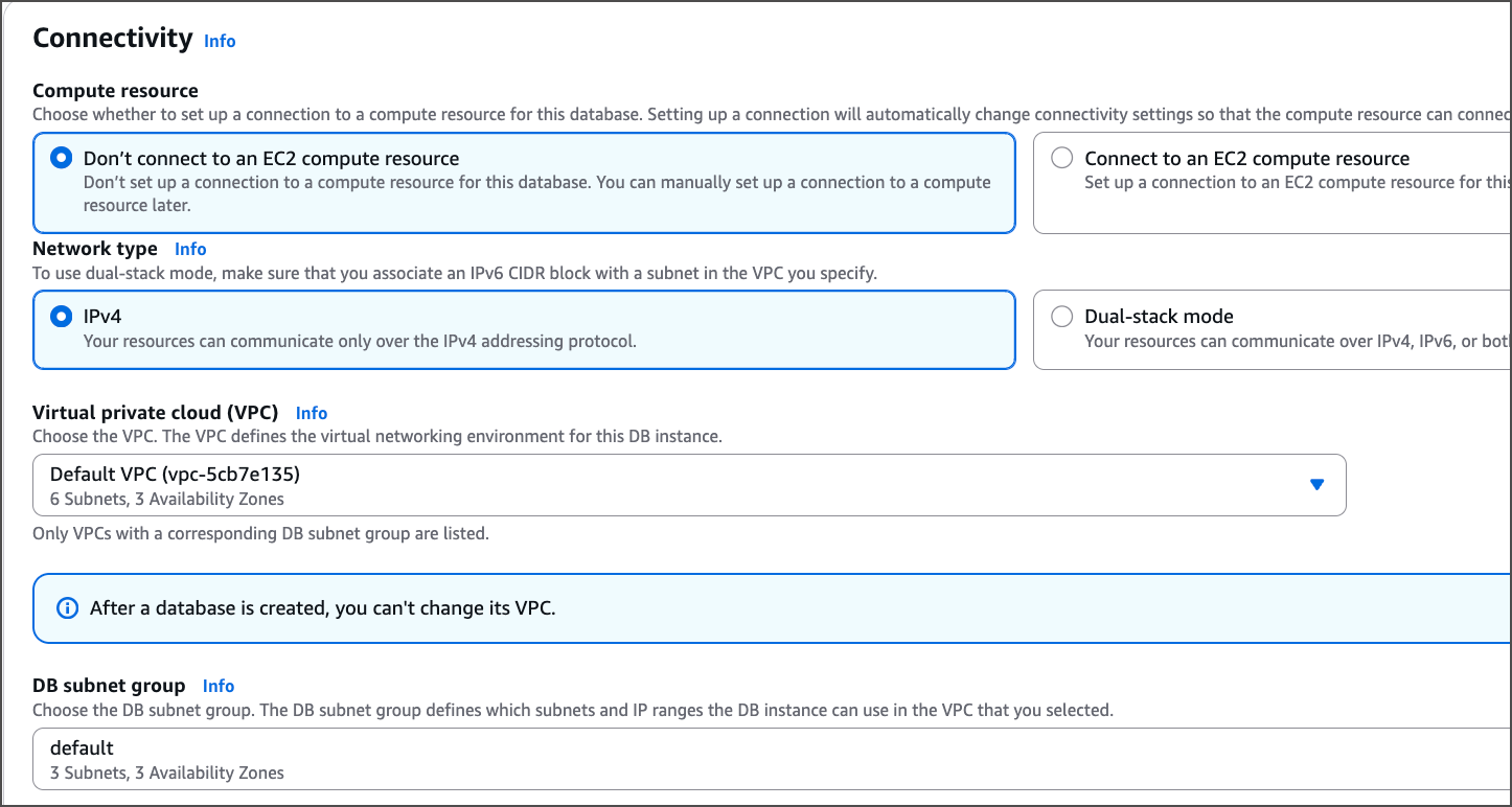 Under Connectivity, configure VPC, subnet group, and security groups as required.