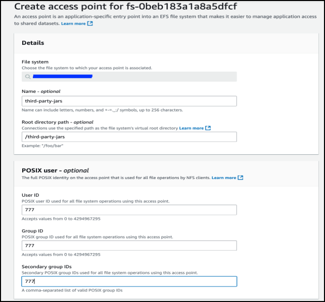 apiVersion: v1 kind: PersistentVolume metadata: name: efs-pv-jars spec: capacity: storage: 2Gi volumeMode: Filesystem accessModes: - ReadWriteMany persistentVolumeReclaimPolicy: Retain storageClassName: efs-sc csi: driver: efs.csi.aws.com volumeHandle: <fs-filesystem_ID>::<AccessPointID>apiVersion: v1 kind: PersistentVolumeClaim metadata: name: efs-claim-jars spec: accessModes: - ReadWriteMany storageClassName: efs-sc resources: requests: storage: 2Gi
