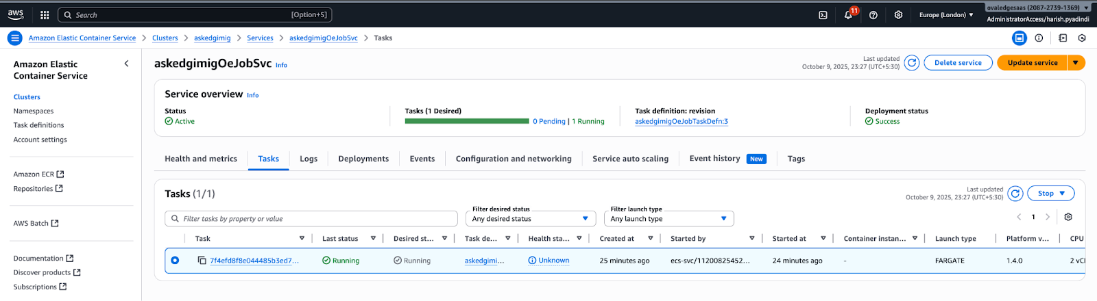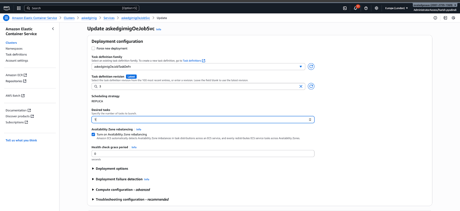 Select the latest version number of the task definition and desired task as 1, scroll down, and click on update.