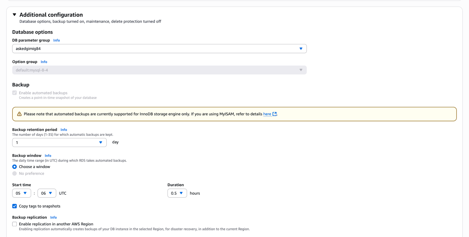 Restore the backup to the new account RDS instance running version 8.4.6.